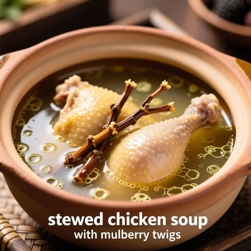 Ingredients: mulberry twig 20g, half old hen (or 100g lean meat), 3 red dates, 3 ginger slices